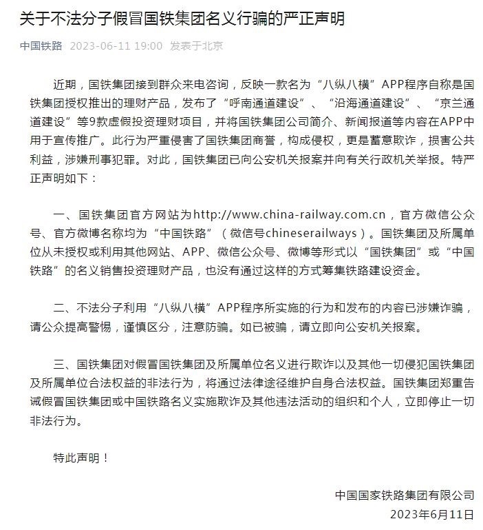 “中國(guó)鐵路”微信公眾號(hào)6月11日發(fā)布嚴(yán)正聲明稱(chēng),近期,國(guó)鐵集團(tuán)接到群眾來(lái)電咨詢(xún),反映一款名為“八縱八橫”APP程序自稱(chēng)是國(guó)鐵集團(tuán)授權(quán)推出的理財(cái)產(chǎn)品,發(fā)布了“呼南通道建設(shè)”、“沿海通道建設(shè)”、“京蘭通道建設(shè)”等9款虛假投資理財(cái)項(xiàng)目,并將國(guó)鐵集團(tuán)公司簡(jiǎn)介、新聞報(bào)道等內(nèi)容在APP中用于宣傳推廣。
