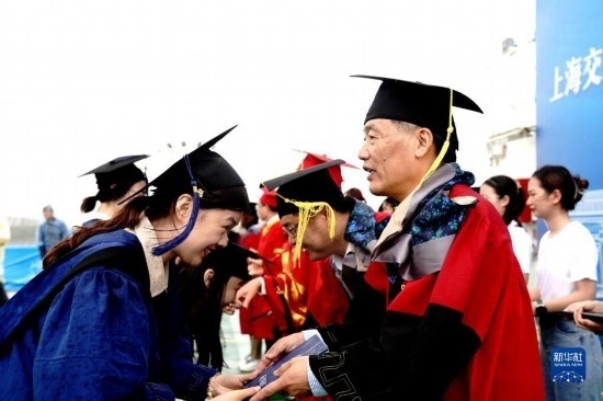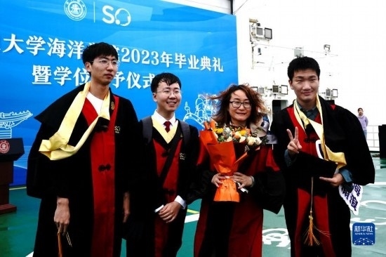 當(dāng)日,上海交通大學(xué)海洋學(xué)院2023年畢業(yè)典禮暨學(xué)位授予儀式在“雪龍2”號(hào)上舉行,70余名畢業(yè)生在甲板上與師長道別?!把?”號(hào)是我國自主建造的第一艘極地科學(xué)考察破冰船。