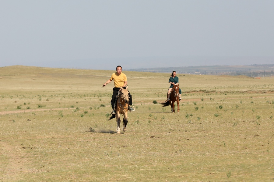 游客在希拉穆仁草原騎馬游玩。記者 張楊攝影