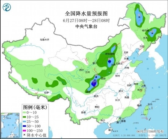 6月27日08時至28日08時,甘肅東南部、陜西、四川盆地、內蒙古中部和東北部、山西西部、黑龍江西部和東南部、吉林東北部、廣東東南部等地部分地區(qū)有中到大雨,其中,山西西部、陜西西南部、四川盆地北部等地部分地區(qū)有暴雨或大暴雨(100~110毫米)。西北地區(qū)東部、華北、江南東部、西藏南部等地部分地區(qū)有4~6級風,其中,內蒙古西北部部分地區(qū)有6~7級風(見圖2)。