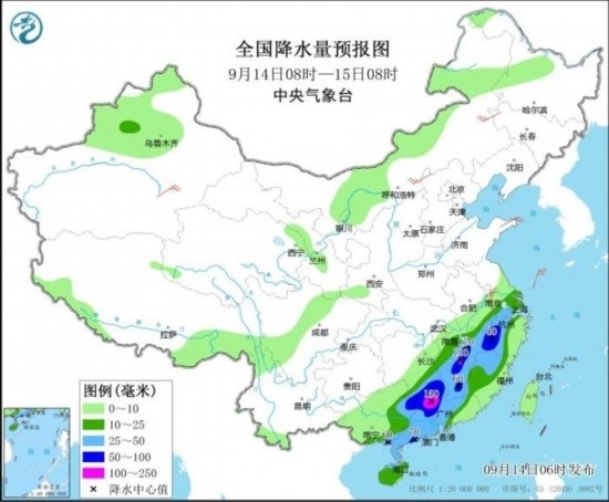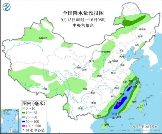 全國(guó)降水量預(yù)報(bào)圖(9月14日08時(shí)-15日08時(shí))