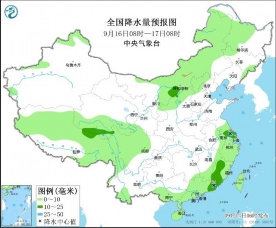 9月16日08時(shí)至17日08時(shí),內(nèi)蒙古東部和西部、黑龍江中西部、吉林西部、新疆北疆北部、西藏大部、西北地區(qū)中部、陜西北部、華北北部、江淮東部、江南中東部和南部、西南地區(qū)北部、四川盆地西北部、華南大部、臺(tái)灣島等地部分地區(qū)有小到中雨,其中,江蘇中南部、廣東東南部等地部分地區(qū)有大雨(25~40毫米)。內(nèi)蒙古中部、遼東半島、山東半島等地部分地區(qū)有4~5級(jí)風(fēng)。