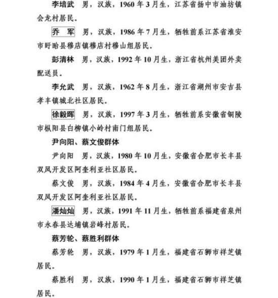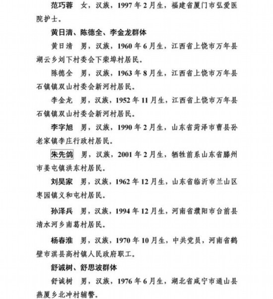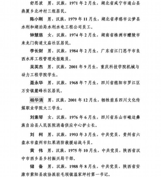 上榜勇士中,有從高橋上跳水救人導(dǎo)致胸椎骨折的外賣(mài)小哥彭清林和另一位高橋跳水救人的中學(xué)教師丁成闖;有冒著9級(jí)大風(fēng)在海上營(yíng)救遇險(xiǎn)臺(tái)胞的漁民蔡芳輪、蔡勝利;有放棄登頂珠峰機(jī)會(huì)而救助同胞的珠峰登山隊(duì)隊(duì)員范江濤、謝如祥;有萬(wàn)米高空機(jī)艙里搶救瀕危病人的護(hù)士長(zhǎng)劉素琴;有勇斗盜賊被刺幾刀仍不退縮的江蘇村民李培武;有身患癌癥卻橫渡淥江河救人的樂(lè)觀大姐鐘慧慈;有跳進(jìn)充滿沼氣深井救人致多器官感染的山東小伙李字旭;更有冒死救援落水群眾壯烈犧牲的潘燦燦、朱先鴿、尹新朋、喬軍、徐毅暉、楊華清、陳江七位勇士,讓我們致以最崇高的敬意!