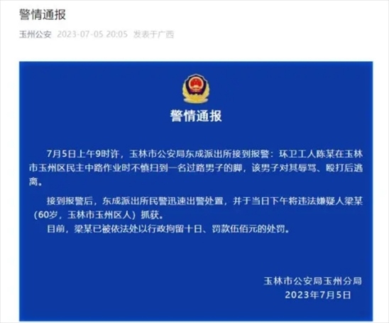 ·環(huán)衛(wèi)工不慎掃到男子腳被辱罵毆打,廣西玉林警方通報(bào)。