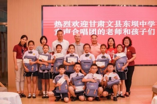7月4日中午,在中國(guó)記協(xié)會(huì)客廳,文縣東壩童聲合唱團(tuán)的孩子們見(jiàn)到了他們熟悉的中國(guó)記協(xié)黨組書(shū)記、副主席劉思揚(yáng)爺爺。今年2月,劉思揚(yáng)爺爺專門(mén)來(lái)到文縣,走進(jìn)他們的排練廳,聆聽(tīng)了他們即將在甘肅廣播電視總臺(tái)演出的曲目。他當(dāng)場(chǎng)說(shuō):“我被孩子們眼中的光深深地觸動(dòng)了。這是一種自信的、堅(jiān)毅的光。帶著這種光,無(wú)論你們將來(lái)走出大山,還是學(xué)成后回到山里建設(shè)家鄉(xiāng),這種自信和堅(jiān)毅的情愫都將伴隨你們終生?!苯裉旌⒆觽兌汲闪藙⑺紦P(yáng)爺爺?shù)男】腿?。劉爺爺給孩子們講述了什么是記者、什么是記協(xié),鼓勵(lì)孩子們好好學(xué)習(xí),將來(lái)報(bào)效祖國(guó)。劉爺爺還為每個(gè)孩子準(zhǔn)備了滿滿一個(gè)大書(shū)包的各種禮物。孩子們排著演出隊(duì)形,為中國(guó)記協(xié)的老師們唱出了《大山里的孩子》,還有那首剛剛學(xué)會(huì)的、走進(jìn)央視錄音棚的《童心里的中國(guó)》: