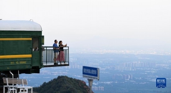 7月9日,游客在新密市伏羲山一處觀景臺游玩。