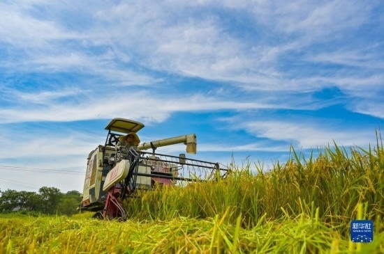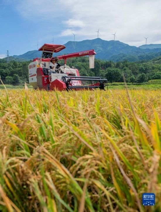 7月10日,在湖南省永州市道縣四馬橋鎮(zhèn)金獅庵村,農(nóng)民駕駛農(nóng)機(jī)在田間收割早稻。