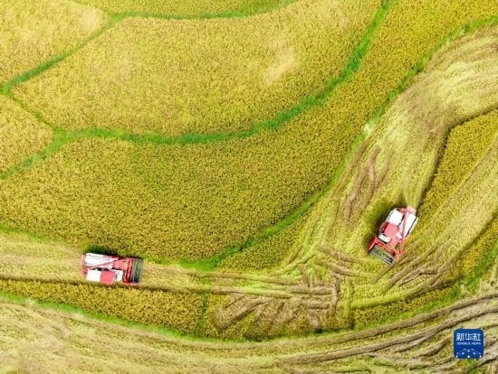 7月10日,在湖南省永州市道縣四馬橋鎮(zhèn)金獅庵村,農(nóng)民駕駛農(nóng)機(jī)在田間收割早稻(無(wú)人機(jī)照片)。