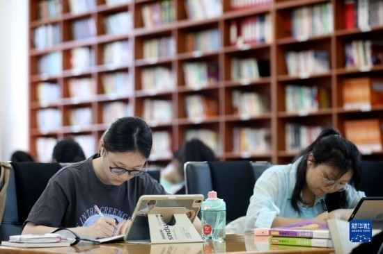 7月12日,幾名學(xué)生在湖南省資興市圖書館學(xué)習(xí)。