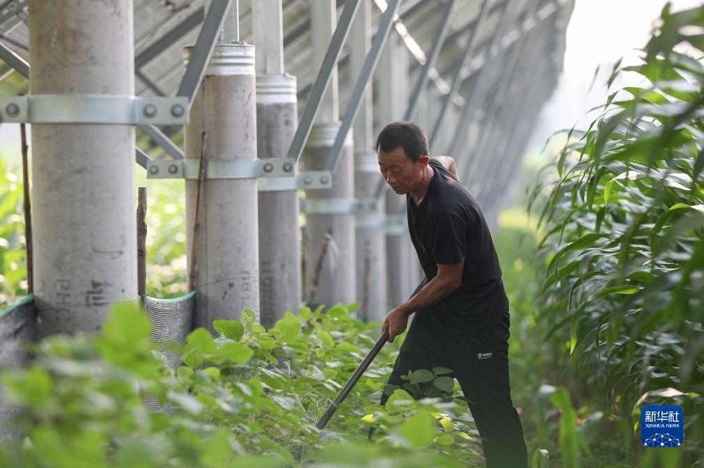 7月11日,在遼寧省彰武縣馮家鎮(zhèn)哈大冷村,村民為太陽能光伏電板下方的作物除草。