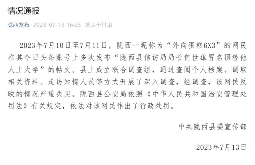 ·信訪局局長被舉報冒名頂替他人上大學(xué),甘肅隴西縣通報:嚴重失實!