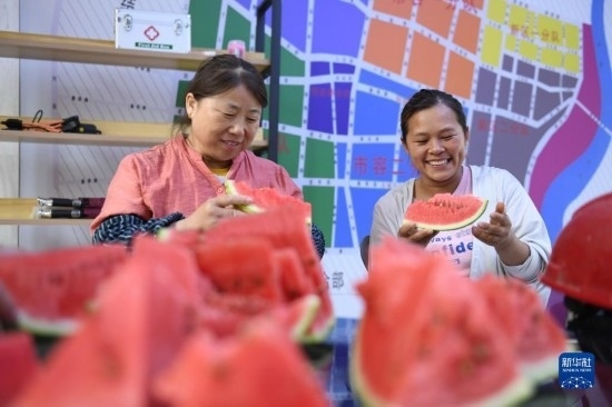 7月21日,山東省臨沂市郯城縣建筑工人在“愛心驛站”吃瓜消暑。新華社發(fā)(房德華 攝)