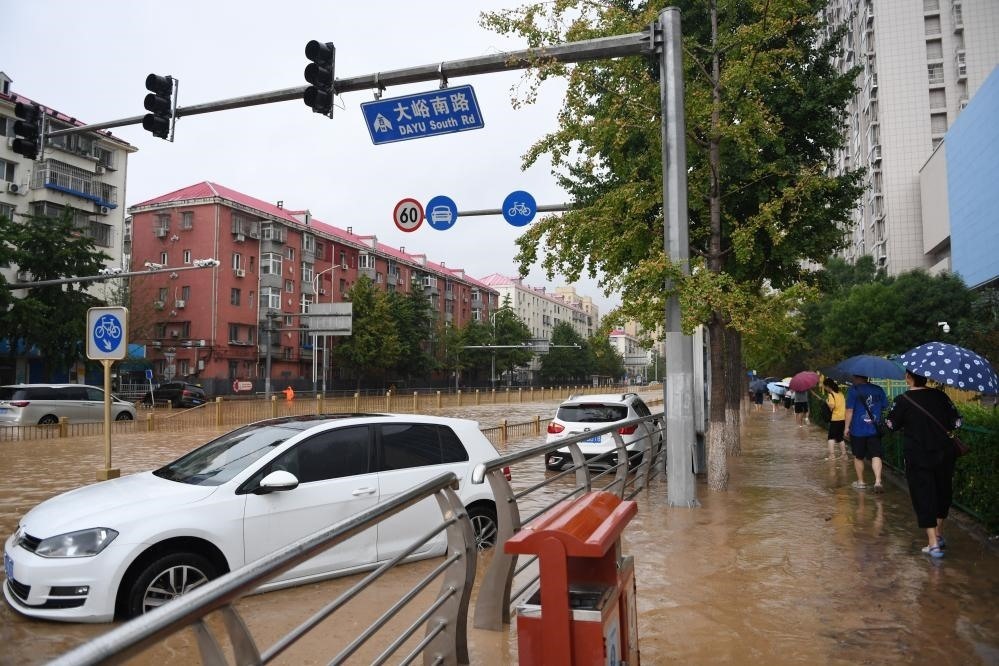 7月31日,在門頭溝區(qū)大峪南路,行人從積水的路面和泡水的車輛旁走過(guò)。新華社記者 鞠煥宗 攝