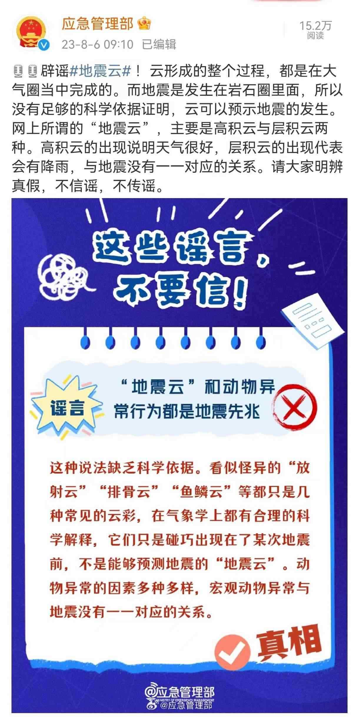 人民網(wǎng)北京8月6日電 (周靜圓)據(jù)中國地震臺(tái)網(wǎng)正式測(cè)定:8月6日2時(shí)33分在山東省德州市平原縣發(fā)生5.5級(jí)地震,震源深度10千米。地震發(fā)生后,有網(wǎng)友曬出自己拍下的云層,有關(guān)“地震云能預(yù)測(cè)地震”的說法在網(wǎng)絡(luò)上廣泛傳播。8月6日,應(yīng)急管理部官方微博就所謂“地震云”相關(guān)說法進(jìn)行辟謠。