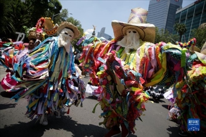 8月9日,在墨西哥首都墨西哥城,演員身著傳統(tǒng)服飾參加世界土著人民國際日慶?;顒?。1994年聯(lián)合國大會通過決議,將每年8月9日定為世界土著人民國際日。