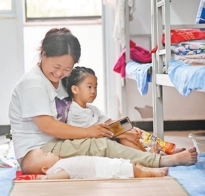 8月12日,在天津市靜海區(qū)大邱莊中學集中安置點,轉移群眾在宿舍內照看孩子。新華社記者 趙子碩攝
