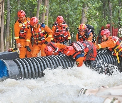 8月6日,在河北省涿州市刁窩鎮(zhèn)東張村,唐山消防救援支隊隊員進行排澇作業(yè)。新華社記者 牟 宇攝