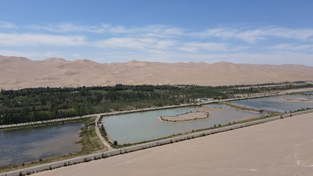 在距離月牙泉5公里的地方,有一處人稱“十二連湖”的景觀。十二個人工水池宛若明鏡,倒映藍(lán)天,時有水鳥掠過。