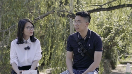 侯霄霖(右)與澎湃新聞記者。