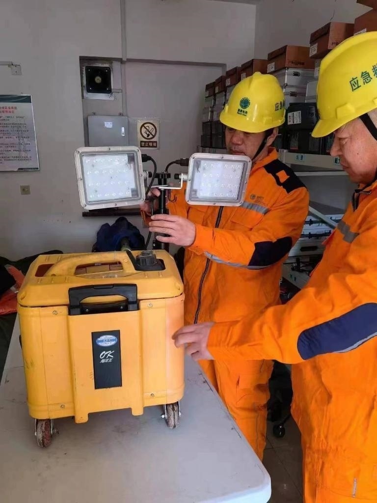 在鳳城市藍旗鎮(zhèn)廣勝村小學(xué)臨時安置點,藍旗鎮(zhèn)供電所工作人員正在調(diào)試應(yīng)急照明設(shè)備。(國網(wǎng)丹東供電公司供圖)