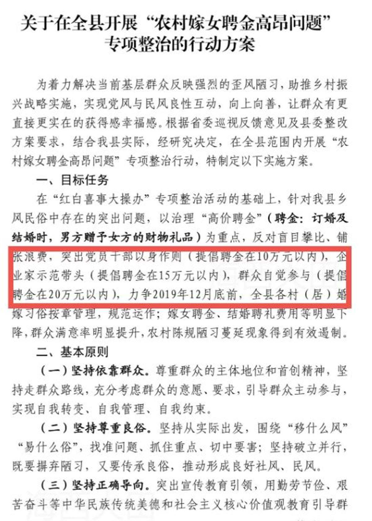 2019年5月,大田縣委辦公室就印發(fā)《關(guān)于在全縣開展“農(nóng)村嫁女聘金高昂問題”專項整治的行動方案》的通知。方案內(nèi)容有,針對該縣鄉(xiāng)風民俗中存在的突出問題,以治理“高價聘金”為重點,反對盲目攀比、鋪張浪費,突出黨員干部以身作則(提倡聘金在10萬元以內(nèi)),企業(yè)家示范帶頭(提倡聘金在15萬元以內(nèi)),群眾自覺參與(提倡聘金在20萬元以內(nèi)),力爭在2019年12月底前,結(jié)婚聘禮費用等明顯下降。