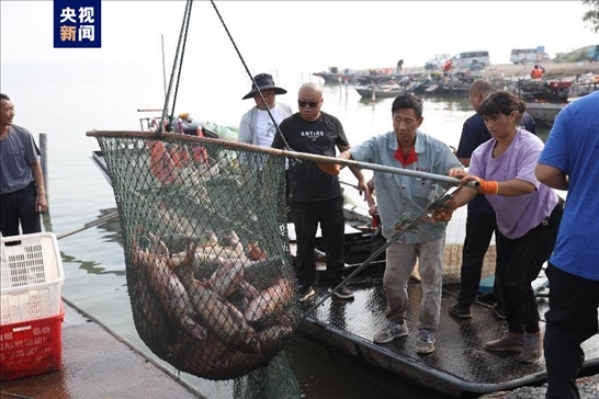 在滿載而歸的漁船上既有鯉魚(yú)、鰱魚(yú)、草魚(yú)、鱖魚(yú)、鯽魚(yú),還有河蟹、小龍蝦、甲魚(yú)等湖鮮,其中漁民劉忠誠(chéng)捕捉到一條 41.6斤的鰱魚(yú),獲得今年的鰱魚(yú)王稱(chēng)號(hào)。