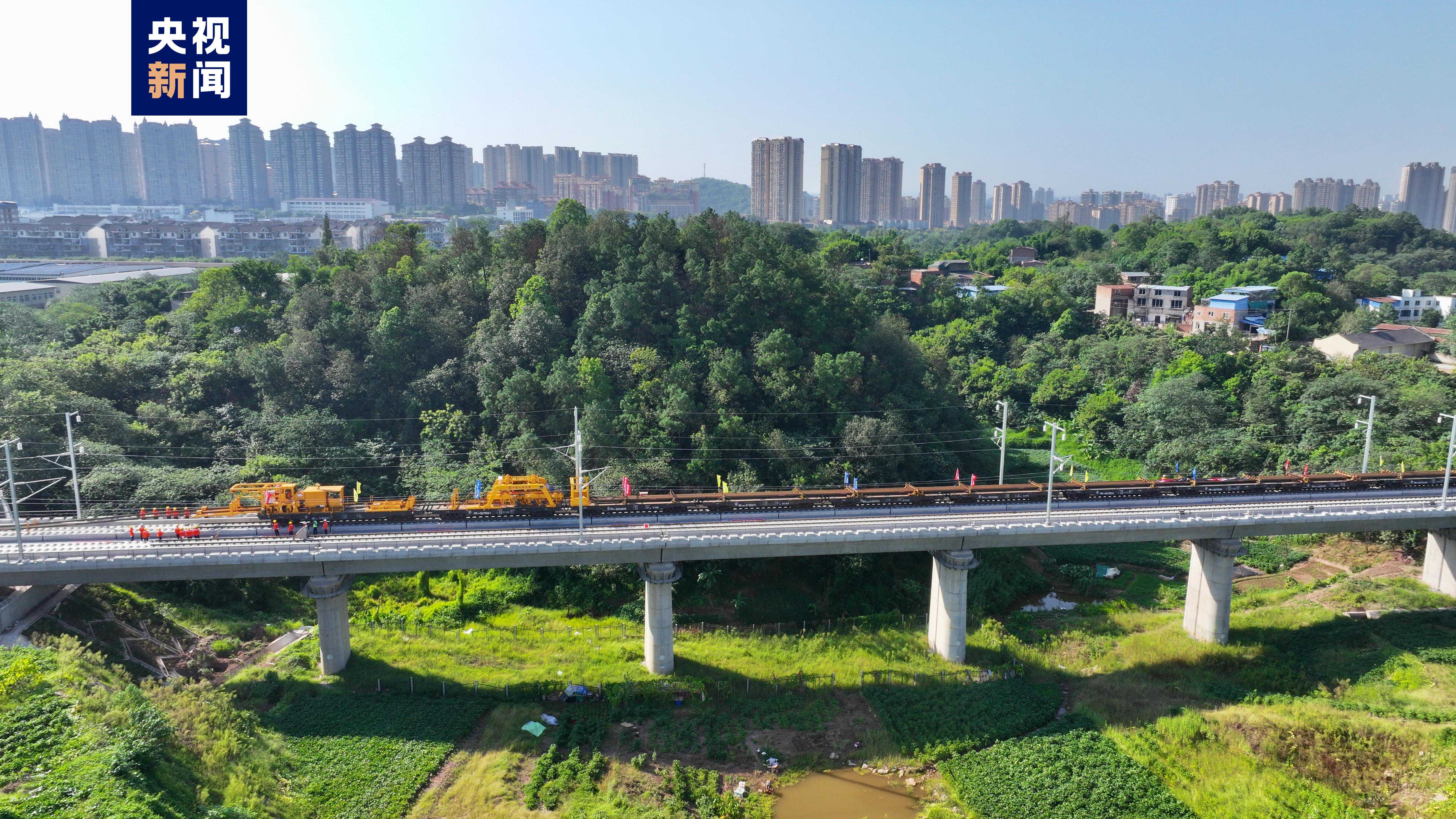 記者從京昆高鐵西昆公司獲悉,9月6日上午9時(shí),在四川省瀘州市馮灣特大橋施工現(xiàn)場(chǎng),隨著第一組500米長鋼軌穩(wěn)穩(wěn)落下,標(biāo)志著重慶至昆明高速鐵路重慶至宜賓段(以下簡稱渝昆高鐵川渝段)全面進(jìn)入鋪軌階段。