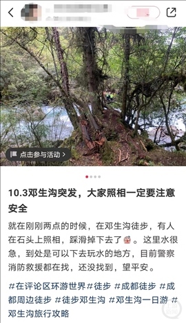 10月3日,游客艾女士(化名)發(fā)布圖片稱,當天下午2點左右,在鄧生溝徒步,有人照相時踩滑掉落水里,水流非常湍急?!笆钦驹谑^上照相,踩滑了掉下去。聽到落水者兒子哭著給家里人打電話說的?!彼€向上游新聞記者表示,落水者是一位女游客,事情發(fā)生后,警方、消防等都在展開救援。多位游客表示,該女游客已被找到,不過已經(jīng)去世。