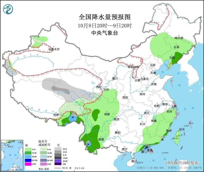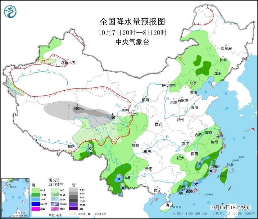 10月6日20時至7日20時,新疆南疆盆地西部沿山地區(qū)、青海南部、西藏東部等地有小到中雪或雨夾雪;西藏東南部、四川盆地東部和南部、云南中東部、福建中南部、廣東東部、海南島南部、臺灣島西部等地部分地區(qū)有中到大雨,其中,廣東東部和福建南部沿海等地局部地區(qū)有暴雨(50~65毫米)。內(nèi)蒙古中東部、遼東半島、浙江東部沿海等地部分地區(qū)有4~6級風,西藏中部部分地區(qū)有6~7級風。臺灣海峽將有6~7級、陣風8級的東北風,南海東北部海域?qū)⒂?~9級、陣風10級的偏北風(見圖1)。
