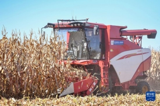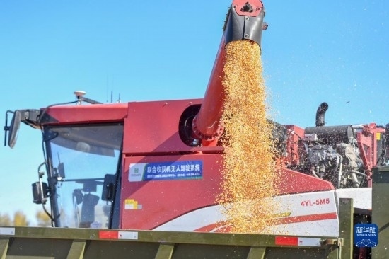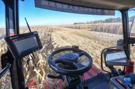 10月19日,在中國科學院“黑土糧倉”科技會戰(zhàn)長春示范區(qū)公主嶺示范基地,無人駕駛農機在收獲玉米。