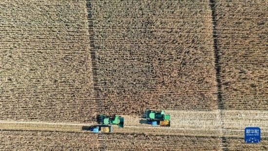 10月19日,在中國科學院“黑土糧倉”科技會戰(zhàn)長春示范區(qū)公主嶺示范基地,工作人員駕駛農機收獲玉米(無人機照片)。
