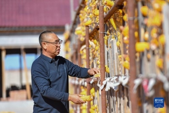 10月19日,在吉林省公主嶺市友忠種植農民專業(yè)合作社,理事長孫友忠查看科學儲糧倉中的玉米儲存情況。