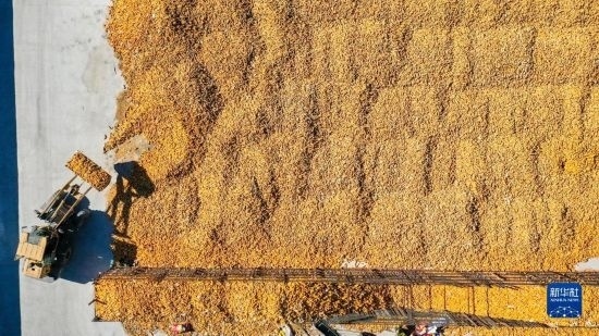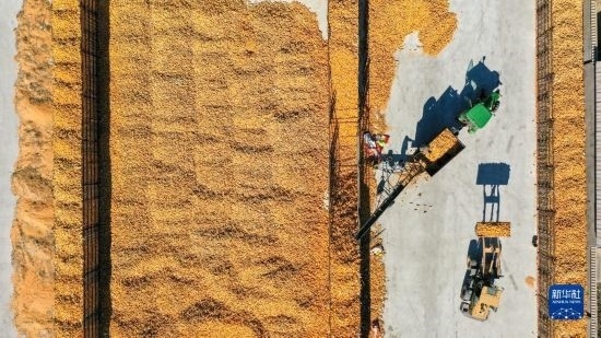 10月19日,在吉林省公主嶺市友忠種植農民專業(yè)合作社,農民將收獲的玉米放入科學儲糧倉(無人機照片)。