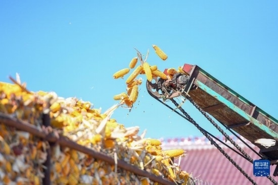 10月19日,在吉林省公主嶺市友忠種植農民專業(yè)合作社,農民將收獲的玉米放入科學儲糧倉。