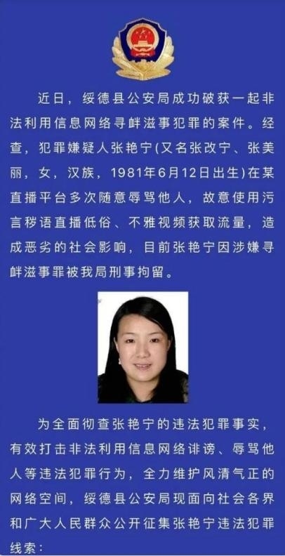 ·網(wǎng)紅“張美麗”被刑拘,陜西綏德警方征集違法犯罪線索。
