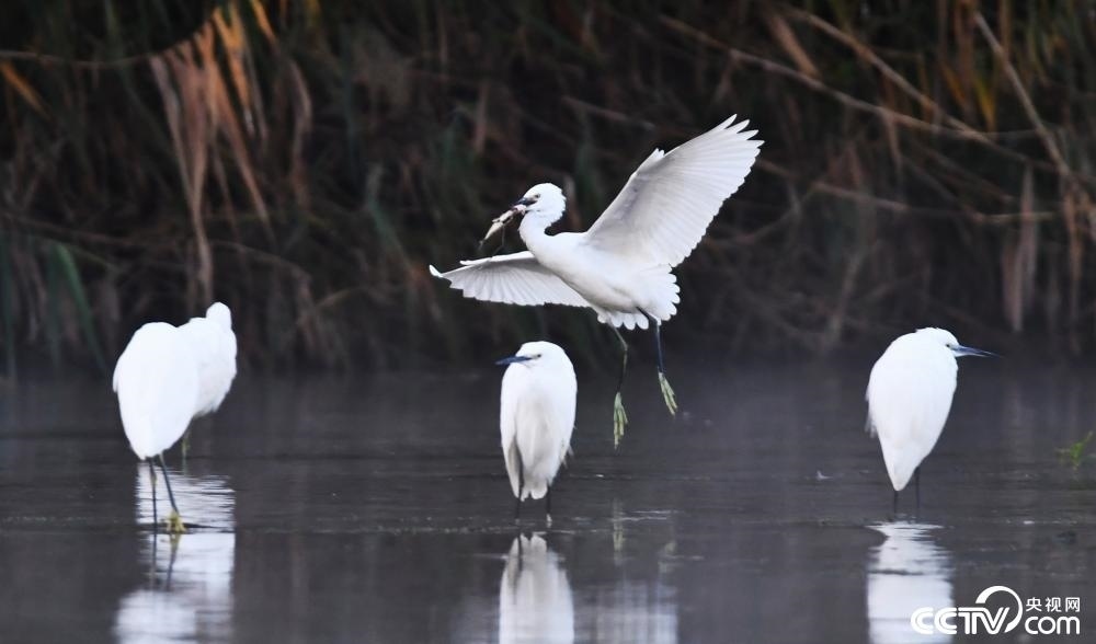 金秋時(shí)節(jié),白鷺在山東省滕州市上善公園水域飛舞、嬉戲、覓食。