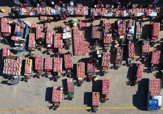 10月20日,果農(nóng)在延安市洛川縣一家果業(yè)企業(yè)售賣蘋果(無人機照片)。