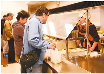 10月17日,北京市朝陽區(qū)團結(jié)湖福壽苑老年餐桌食堂內(nèi),顧客在挑選晚餐。黃金玉攝