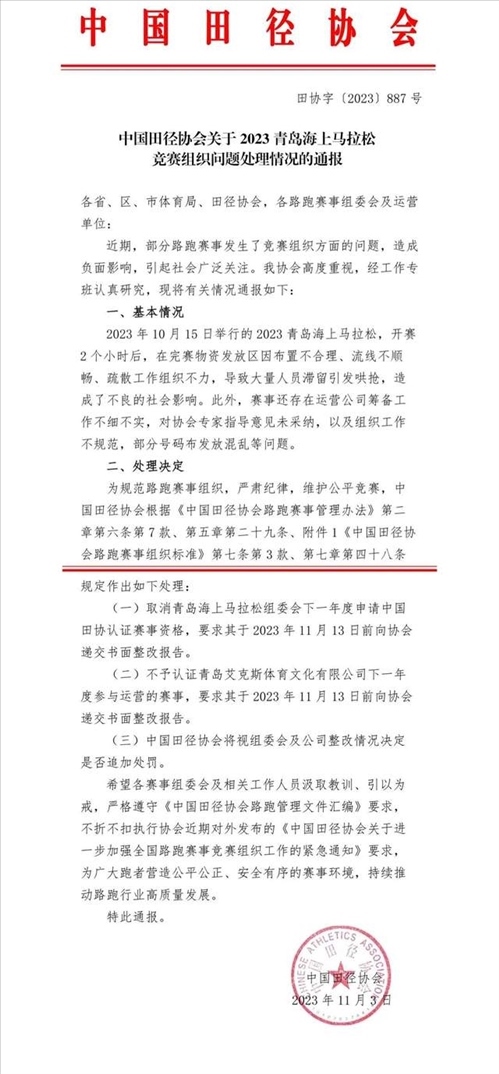 ·中國(guó)田協(xié)通報(bào)大連馬拉松和青島海上馬拉松問題處理情況。