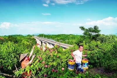 湖南省芷江侗族自治縣的果農(nóng)在鐵路橋附近摘桃子。高鐵的建設(shè)開(kāi)通對(duì)沿線群眾發(fā)展產(chǎn)業(yè)有著積極作用。李小平攝