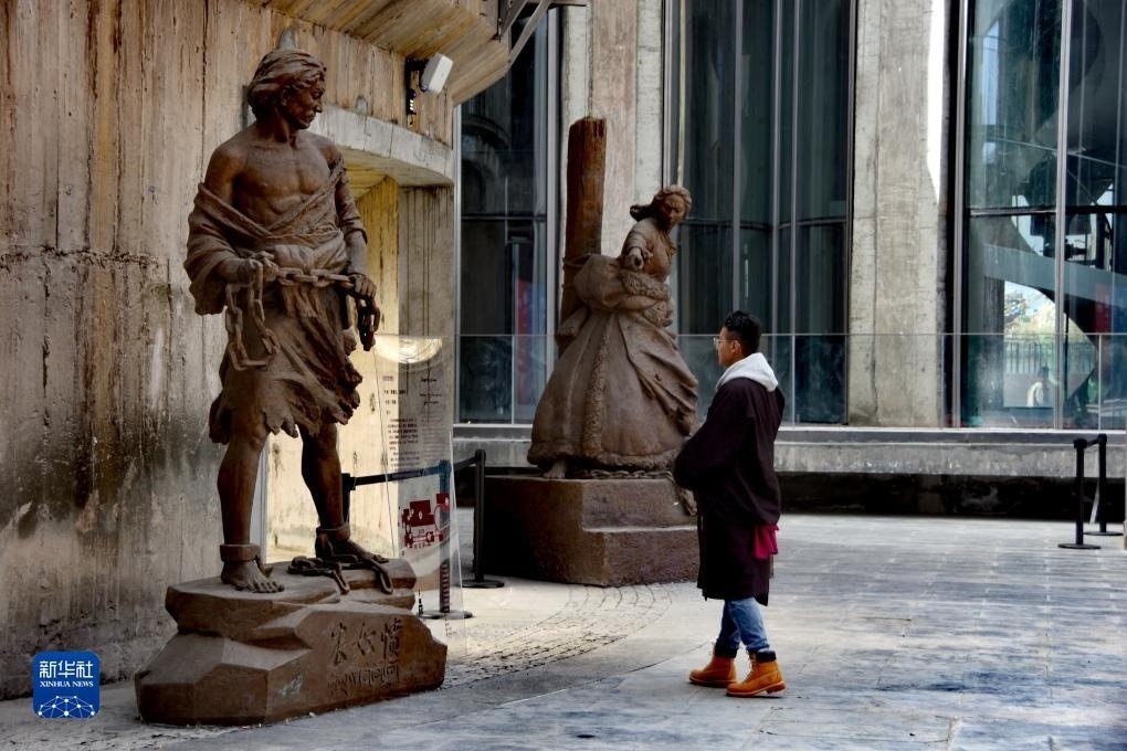 11月15日,觀眾在西藏美術館參觀雕塑作品。新華社記者 劉文博 攝