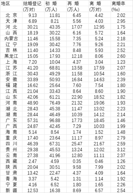 表:2022年31個(gè)省份結(jié)婚登記、初婚、再婚、離婚及離婚率數(shù)據(jù)(數(shù)據(jù)來源:《中國統(tǒng)計(jì)年鑒2023》)