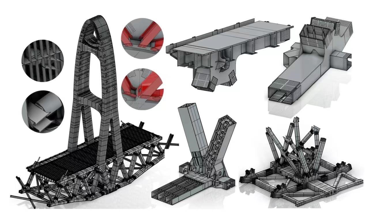 “本橋曲線鋼桁梁構造異常復雜,鋼塔外形為半橢圓變截面,桁架近萬根桿件空間定位要求嚴絲合縫。為了準確表達每個細節(jié),我們采用了BIM正向設計思路,探索出設計—建?!蓤D一體化的設計流程,開發(fā)出自動化建模功能和智能化出圖系統(tǒng),為施工企業(yè)和鋼梁制造廠提供高精度的模型和批量圖紙,精準表達復雜的結構信息和設計意圖,打通了設計—制造—施工全過程信息傳遞路徑,有效節(jié)約了工期與造價。”中鐵設計集團大橋項目主管總工彭嵐平向我們講述了大橋采用的最新智能化設計手段。
