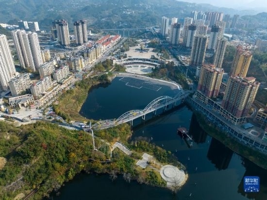 11月29日拍攝的貴州省遵義市正安縣濕地公園與民居一景(無人機(jī)照片)。