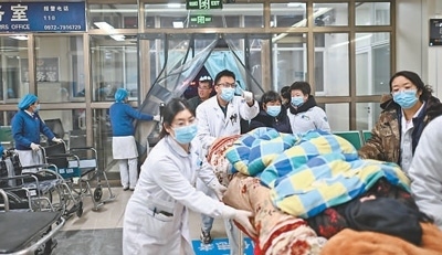 12月19日,一名地震傷員在青海省海東市民和回族土族自治縣人民醫(yī)院接受救治。新華社記者 張宏祥攝