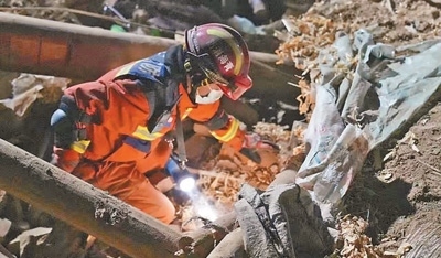 12月19日凌晨4時30分許,青海省海東市消防救援支隊消防救援人員在民和回族土族自治縣搜救被困人員。亓玉昆 祁 棟攝影報道