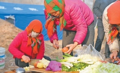 12月19日16時20分許,在青海省海東市民和回族土族自治縣金田村安置點,受災群眾正在帳篷旁準備晚飯。本報記者 賀 勇攝