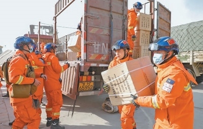 12月19日,在積石山縣大河家鎮(zhèn)大河村安置點,消防人員搬運物資。新華社記者方 欣攝