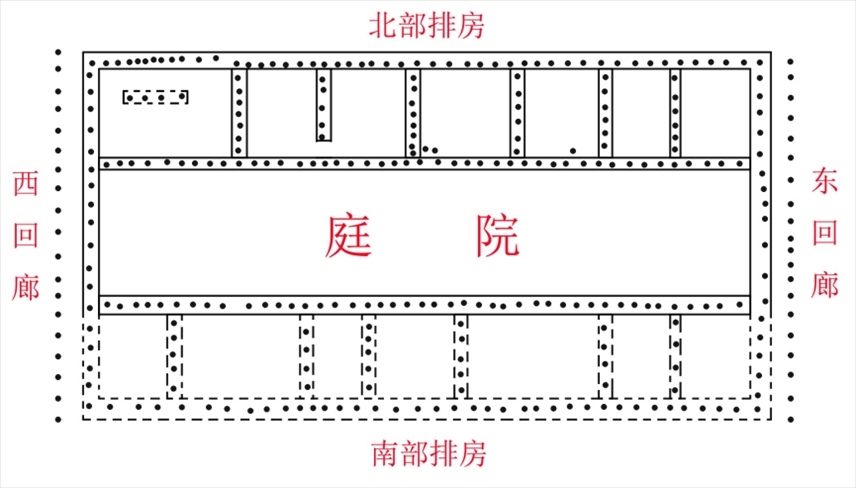 “從柱洞的分布規(guī)律來(lái)看,這一夯土臺(tái)基整體應(yīng)是南北為排房建筑、中部為庭院、東西帶回廊的結(jié)構(gòu),規(guī)模宏大,結(jié)構(gòu)復(fù)雜?!惫懦钦z址發(fā)掘現(xiàn)場(chǎng)負(fù)責(zé)人李博說(shuō)。
