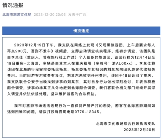 ·官方通報“廣西一旅行團要求游客上車后每人再交200元”。